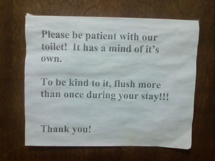 This may be is my favorite sign that I have ever seen in a church bathroom. I think it makes a good point – we never really consider the feelings of the toilets we use. Without going into too much detail, I would say that most of what we do to a toilet would be considered fairly rude in any other context. Maybe it’s about time some toilets get a mind of their own. I just hope that they never get to the point where they can retaliate because they will be able to catch us in the most vulnerable of positions.